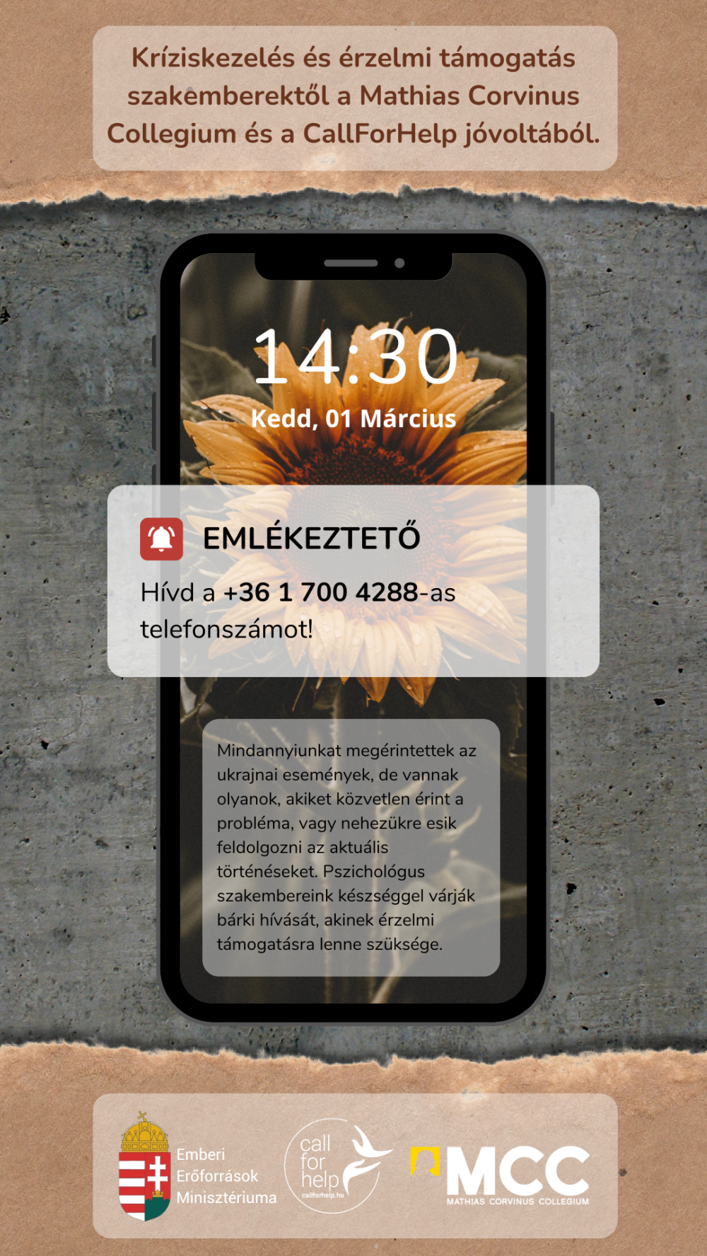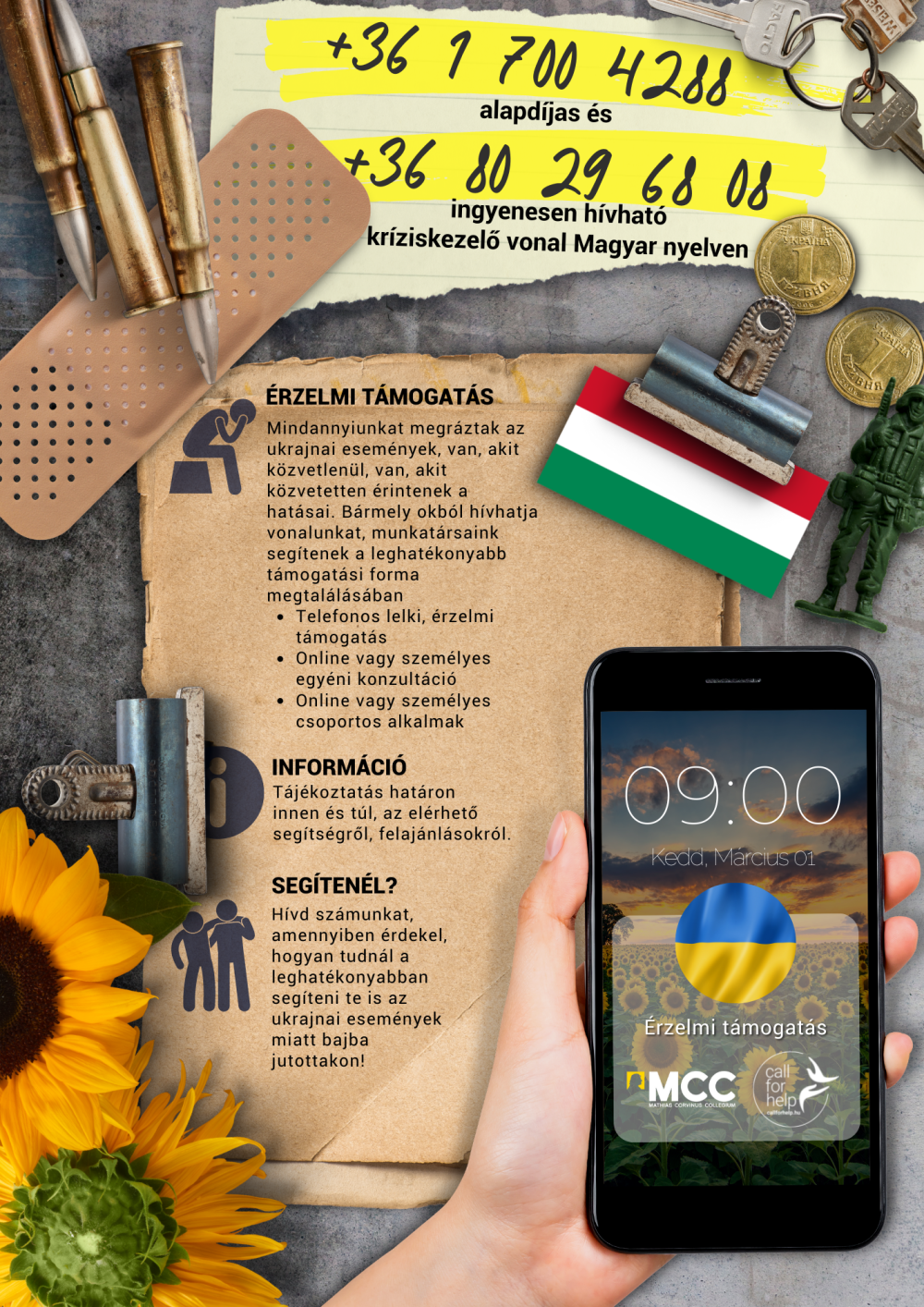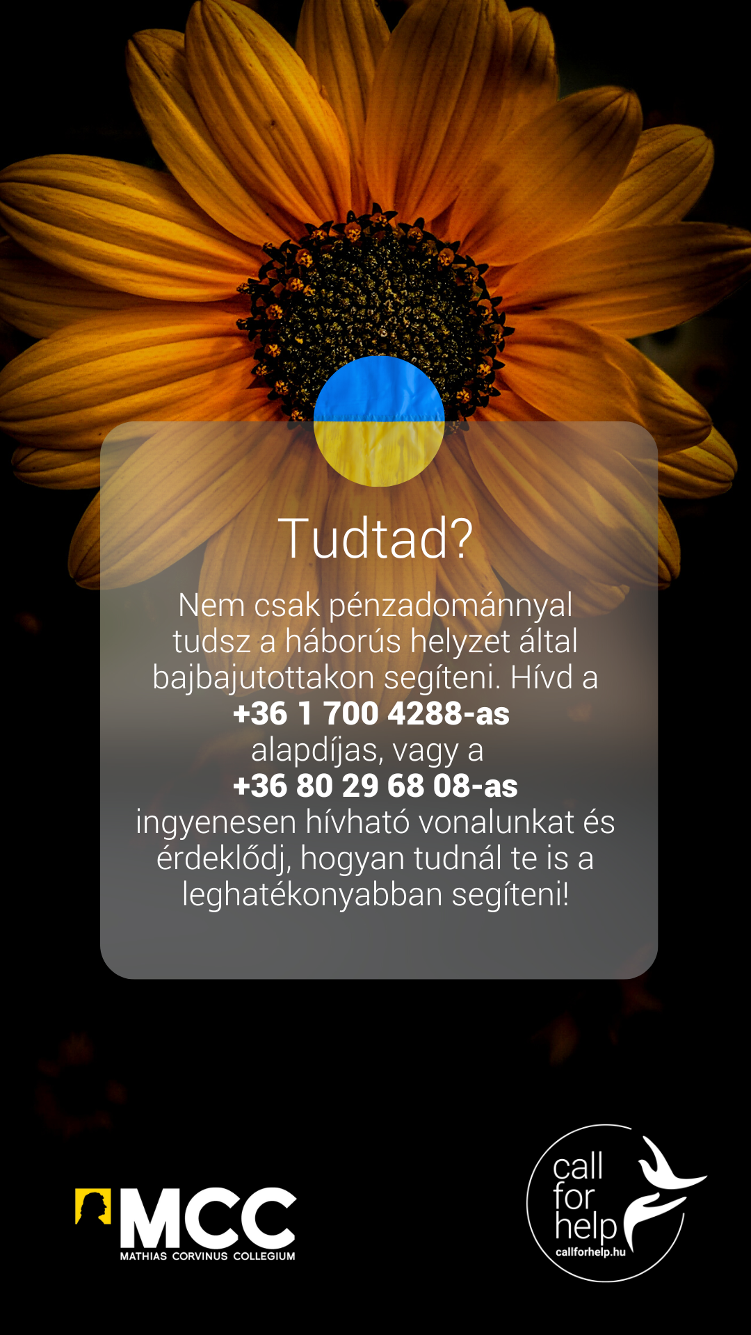 A CallForHelp vonalai izzotak a járványhelyzet alatt, és a munka azóta is folyik, hiszen az orosz-ukrán háború miatt nehéz helyzetbe kerülőknek is szükségük van lelki segítségnyújtásra. A Mathias Corvinus Collegium ezen a ponton csatlakozott a kezdeményezéshez: külön krízisvonal létrehozását szorgalmazta a kárpátaljai magyaroknak, a külhoni MCC-s munkatársaknak, a hallgatóknak és családjaiknak. A tehetséggondozó intézmény diákjai hívásirányítóként és szervezőként kapcsolódtak be az akcióba, illetve a vonal számainak terjesztéséhez és elérhetővé tételéhez is hozzájárultak.