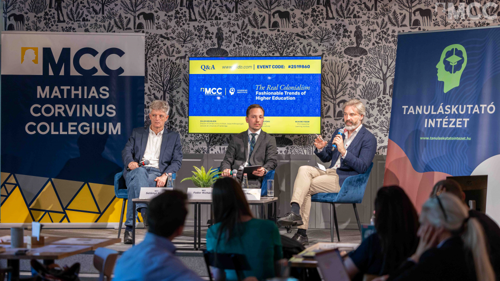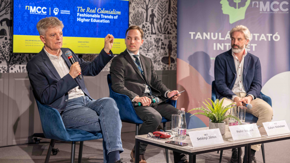 „Az egyetem ideálja Angliában Oxford vagy Cambridge sikeres utánzatai. Ez azt jelenti, hogy az egyetemnek ősi, autonóm kollegiálisnak kell lennie, de inkább az oktatásnak, mint a képzésnek szentelve, inkább nemzetinek, mint tartományinak, és kizárólagosnak kell lennie a hallgatók gondosan kiválasztott csoportja számára, nem pedig mindenki számára nyitottnak” - olvasta fel a moderátor, Fodor Richárd, a Tanuláskutató Intézet kutatója, aki Setényi Jánossal, a Tanuláskutató Intézet igazgatójával és Calum Nicholson-nal, a Klímaintézet igazgatójával beszélgetett. - Valóban ilyennek kell lennie egy egyetemnek? Messze vagyunk a jó iránytól?